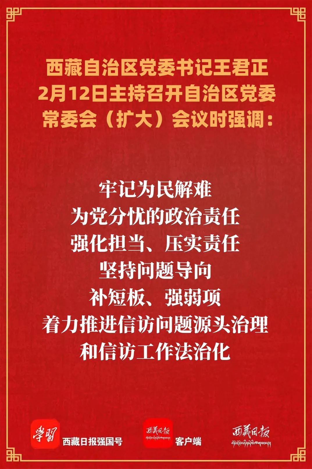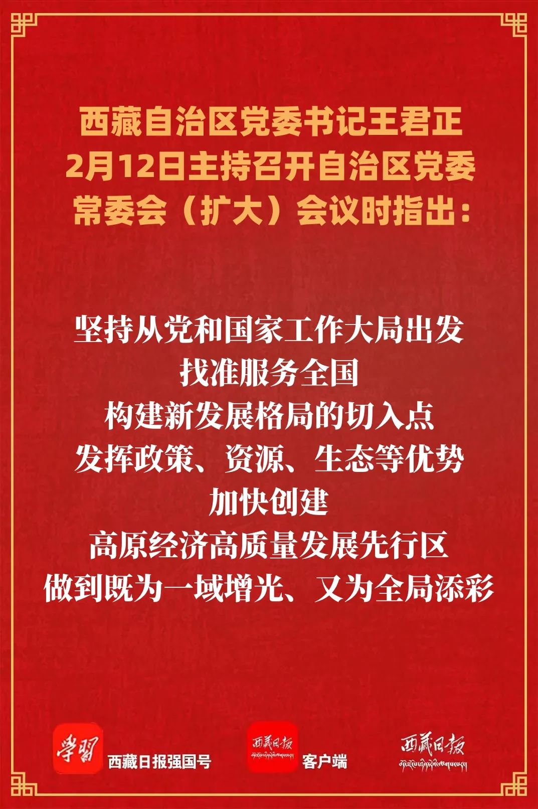 2月12日下午,自治区党委书记王君正主持召开自治区党委常委会(扩大)会议,传达学习习近平总书记在中共中央政治局第二次集体学习时的重要讲话精神。强调,要深入学习贯彻习近平总书记重要讲话精神,立足新发展阶段,完整准确全面贯彻新发展理念,服务融入新发展格局,积极研究新情况,主动解决新问题,着力探索新机制,不断提升经济发展活力和创造力,努力推动西藏经济高质量发展。