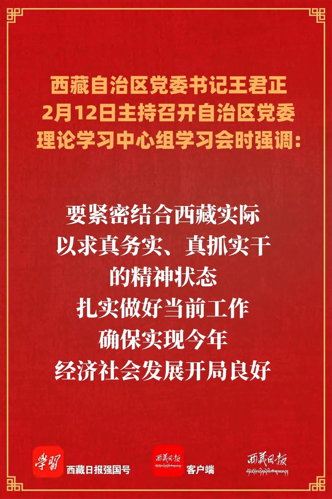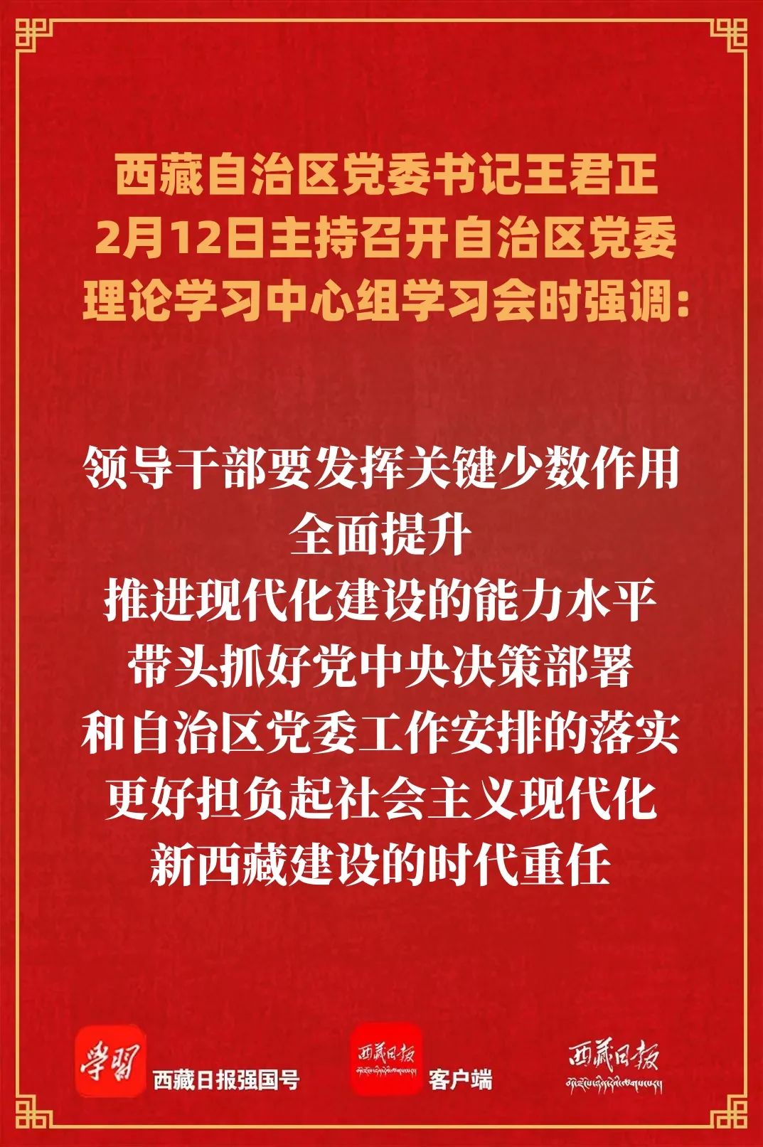 2月12日下午,自治区党委书记王君正主持召开自治区党委理论学习中心组学习会,深入学习习近平总书记在新进中央委员会的委员、候补委员和省部级主要领导干部学习贯彻习近平新时代中国特色社会主义思想和党的二十大精神研讨班开班式上的重要讲话精神。强调,要深刻领悟“两个确立”的决定性意义,坚定坚决做到“两个维护”,切实把思想和行动统一到以习近平同志为核心的党中央决策部署上来,进一步增强推进中国式现代化的责任感和使命感,聚焦“四件大事”聚力“四个创建”,以中国式现代化推动西藏长治久安和高质量发展。