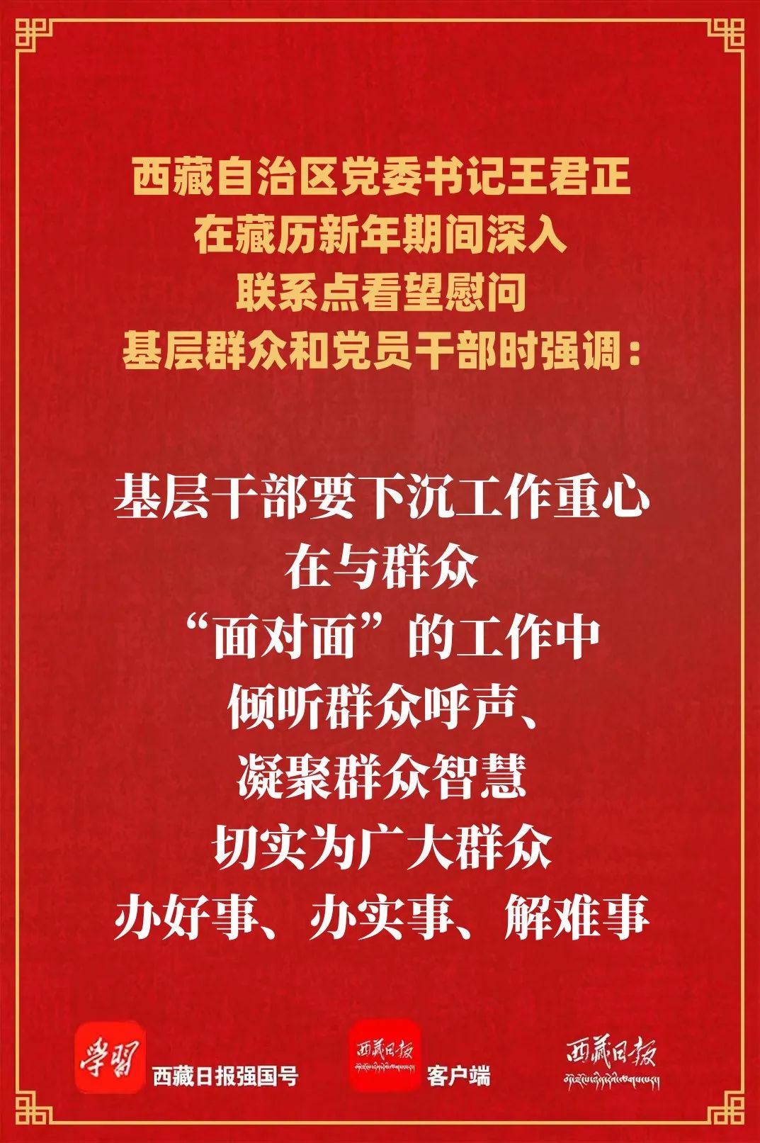 调研中,王君正强调,要深入学习贯彻习近平总书记关于西藏工作重要指示和新时代党的治藏方略,把基层党组织建成坚强战斗堡垒,全面提升基层社会治理体系和治理能力现代化水平,不断增强人民群众获得感幸福感安全感。要坚持“三个赋予一个有利于”,加大民生基础设施建设力度,大力发展特色优势产业,推动巩固拓展脱贫攻坚成果同乡村振兴有效衔接,做深做细“十大民生工程”,采取更多惠民生、暖民心举措,让各族群众获得感成色更足、幸福感更可持续、安全感更有保障。要坚持以铸牢中华民族共同体意识为主线,培育一批民族团结家庭致富带头人、打造一批民族团结双创企业集群、发展一批民族团结特色文化产业,让各族人民共建美好生活、共享发展成果、共促民族团结,打牢铸牢中华民族共同体意识的物质基础。要牢固树立大抓基层的鲜明导向,加强基层“两委”班子建设,选好配强基层党组织书记,不断提升基层社会治理体系和治理能力现代化水平,切实把基层党组织建设成为铸牢中华民族共同体意识、带领群众致富、维护社会稳定、守卫边疆领土、开展反分裂斗争的坚强战斗堡垒。要坚持凭能力用干部、以实绩论英雄,善于在基层一线发现选拔培养使用干部,健全优秀人才脱颖而出的工作机制,努力营造崇尚实干、激励担当的氛围,为改革开放先行提供坚强人才支撑。要坚持问题导向、目标导向,总结经验、巩固成果,补齐工作短板,充分发挥社区的基础性作用,改进网格化管理服务,落实落细“双联户”工作,不断完善问题联治、工作联动、平安联创的工作机制,建设人人有责、人人尽责、人人享有的基层社会治理共同体。要深入实施固边兴边富民行动,构建边民生活有保障、致富有渠道、守边有动力、发展有支撑的新格局,确保边境地区产业发展、基础设施、公共服务水平大幅提升,确保边疆发展、边防巩固、边境安全。