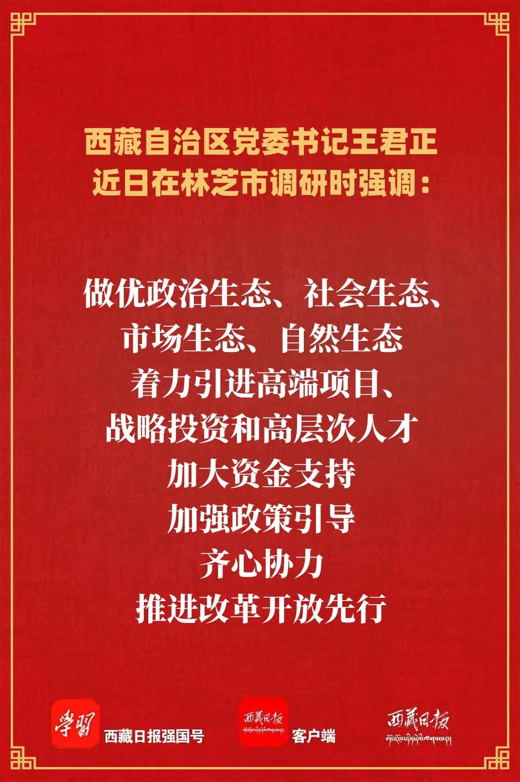 2月20日至24日,自治区党委书记王君正深入林芝市巴宜区、米林县就深入贯彻落实党的二十大精神、加快推动高质量发展和改革开放先行等进行调研,看望慰问坚守岗位的基层干部和一线劳动者,向他们致以美好的藏历新年祝福。强调,要坚持以党的二十大精神为统揽,明确发展定位,发挥综合优势,积极转变观念,深化改革开放,努力推动经济社会高质量发展。