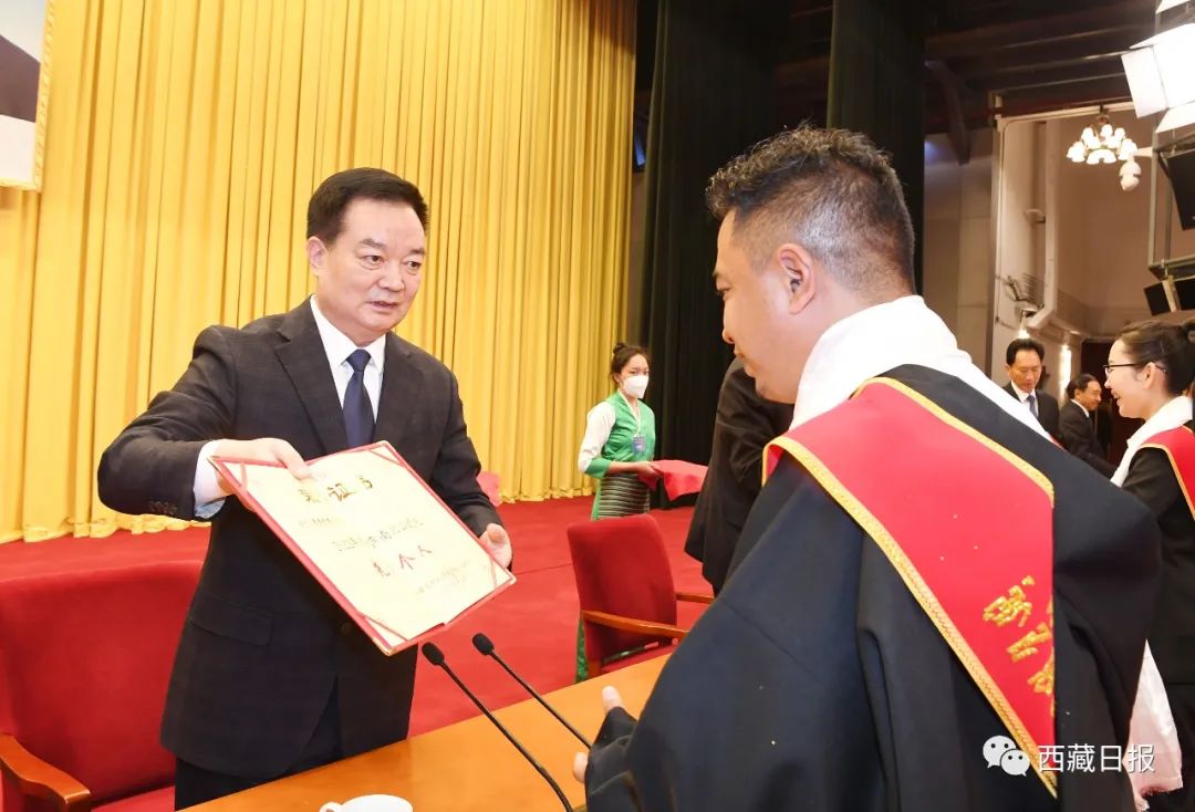 严金海主持会议,庄严宣读表彰决定,陈永奇、普布顿珠、肖友才、达娃次仁出席。在主席台就座的自治区领导为受表彰的先进集体和先进个人代表颁奖。