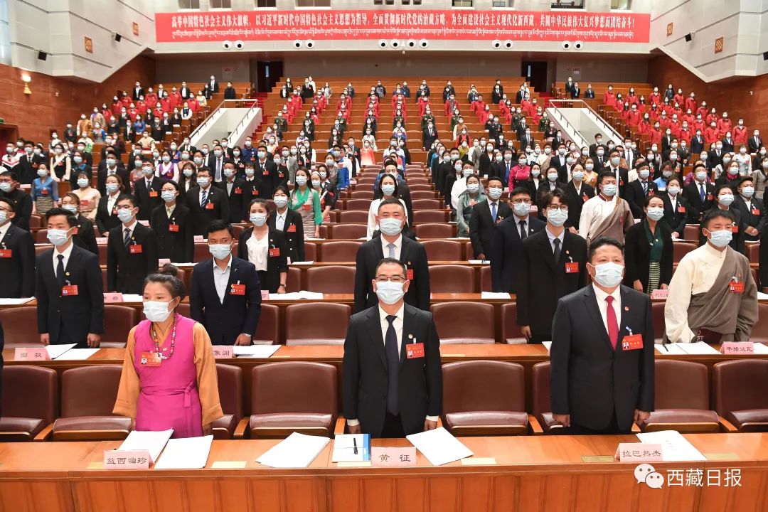 6月10日上午,共青团西藏自治区第十一次代表大会在拉萨开幕。这是参会人员全体起立,高唱国歌。记者 李洲 摄