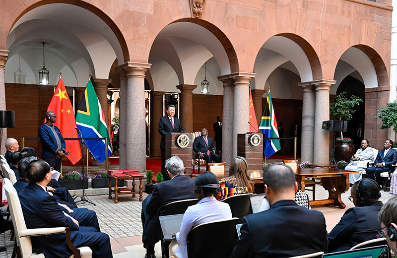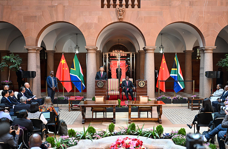 当前,中国共产党正团结带领中国人民以中国式现代化全面推进中华民族伟大复兴,南非也在积极自主探索符合本国国情的发展道路。中南关系面临新的发展机遇。刚才,我同拉马福萨总统举行了富有成果的会谈,就新时代两国关系发展以及共同关心的国际和地区问题交换了意见,达成重要共识。我们见证了一系列重要双边合作文件签署。我对两国友好合作关系前景充满信心。