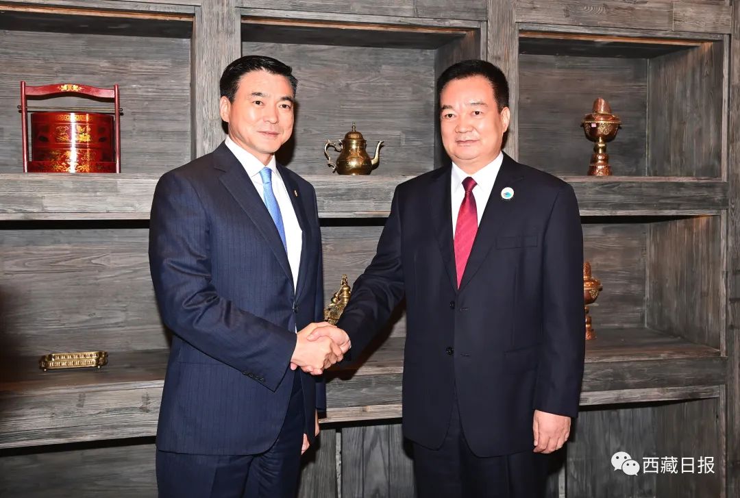 10月5日,自治区党委书记王君正在林芝鲁朗会见来藏出席第三届中国西藏“环喜马拉雅”国际合作论坛的蒙古国副总理阿玛尔赛汗一行。记者 旦增西旦 摄