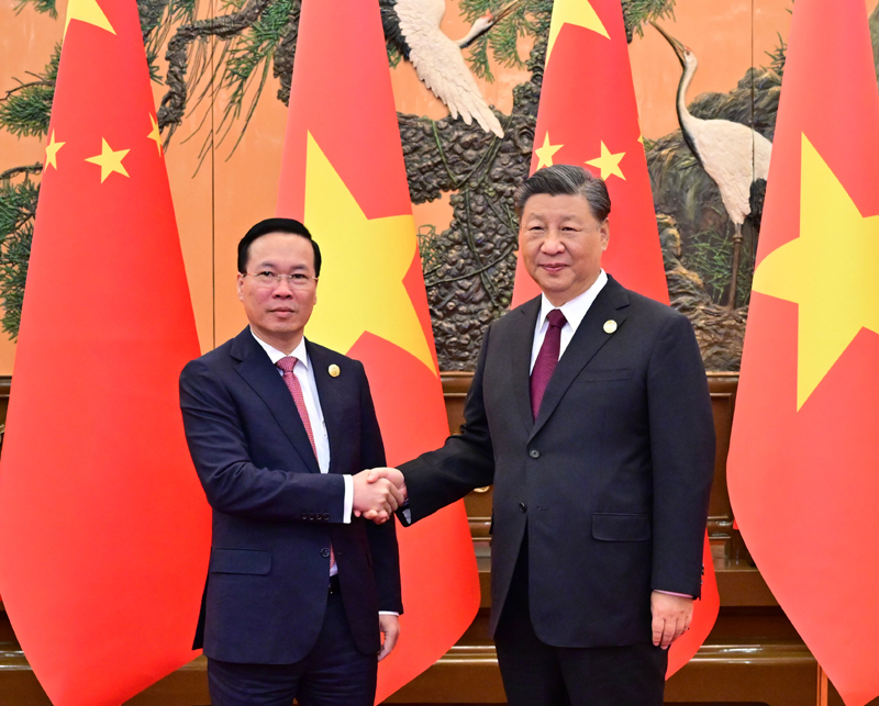 10月20日上午,国家主席习近平在北京人民大会堂会见来华出席第三届“一带一路”国际合作高峰论坛的越南国家主席武文赏。新华社记者 翟健岚 摄