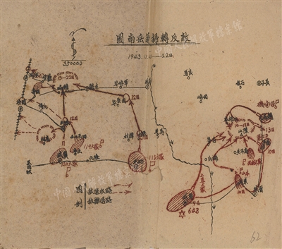 解放军档案馆馆藏档案1943年《敌反转扫荡岳南图》。