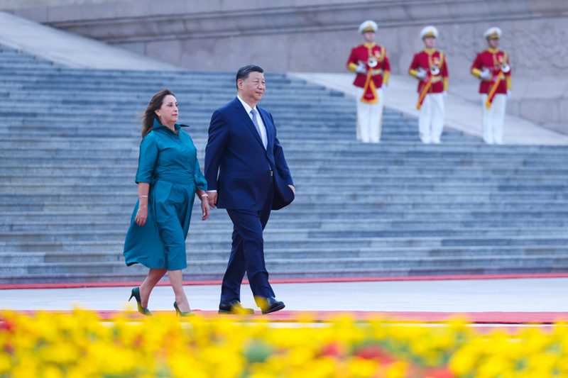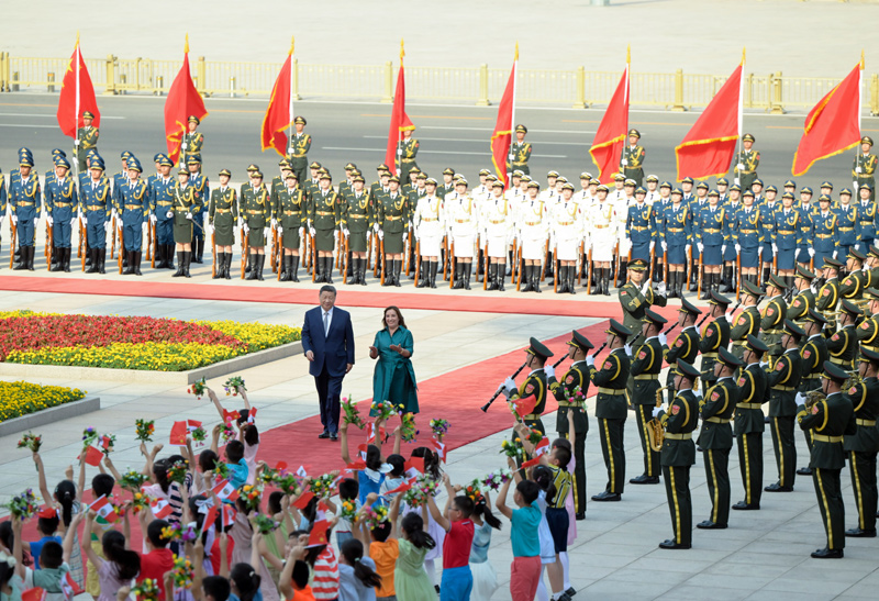6月28日下午,国家主席习近平在北京人民大会堂同来华进行国事访问的秘鲁总统博鲁阿尔特举行会谈。这是会谈前,习近平在人民大会堂东门外广场为博鲁阿尔特举行欢迎仪式。新华社记者 高洁 摄